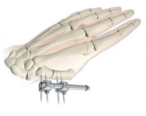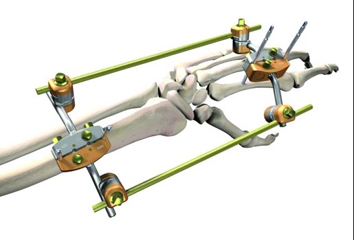 The Hoffmann II Compact upper extremity fixator is designed to complement the anatomy of the distal radius by allowing independent movement of its clamps in multiple planes. It has a simple frame design, and offers versatility and ease of use.
